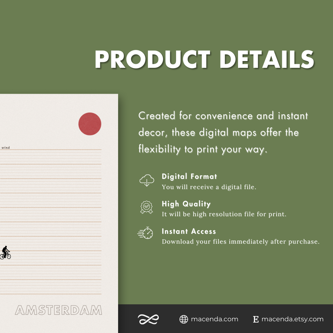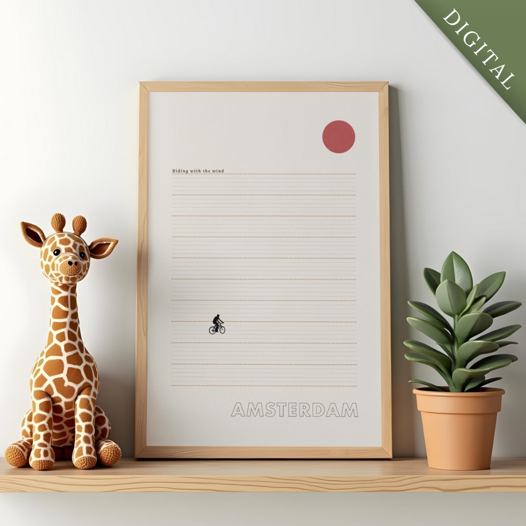 Feel the breeze with this Amsterdam digital download. A charming design featuring bikes and canals. Perfect for a gallery wall. Get it now.