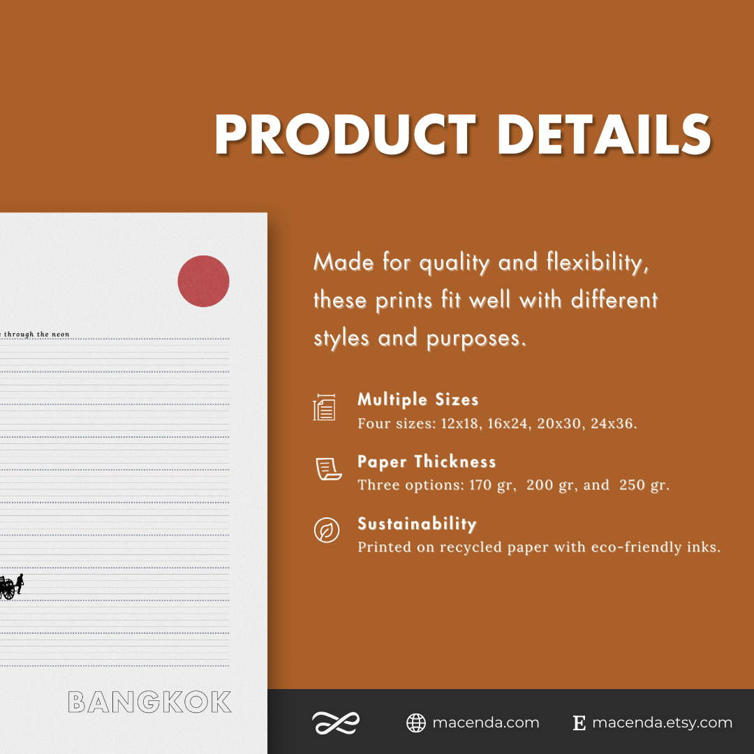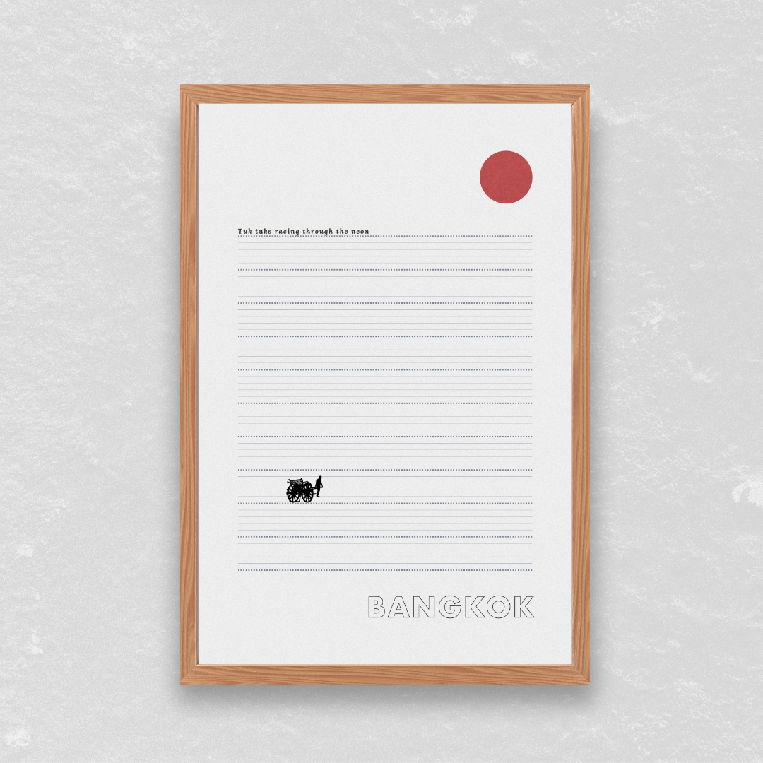 Electric energy in motion. "tuk tuks racing through the neon" captures the chaotic, colorful pulse of Thailand's sleepless capital. This poster designed with intention for minimalist spaces.