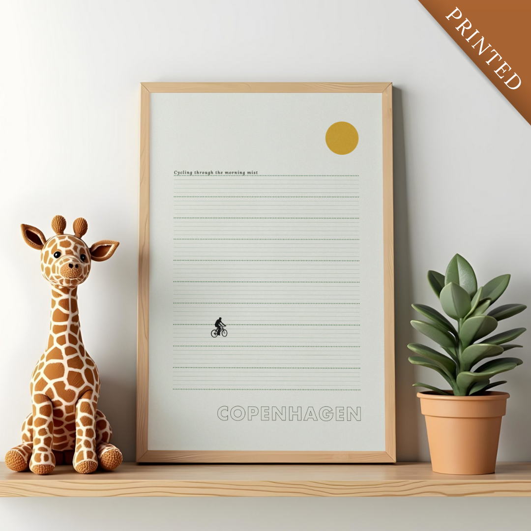 Hygge on two wheels. "cycling through the morning mist" captures the quiet, rhythmic joy of a city designed for people and peace. This poster designed with intention for minimalist spaces.