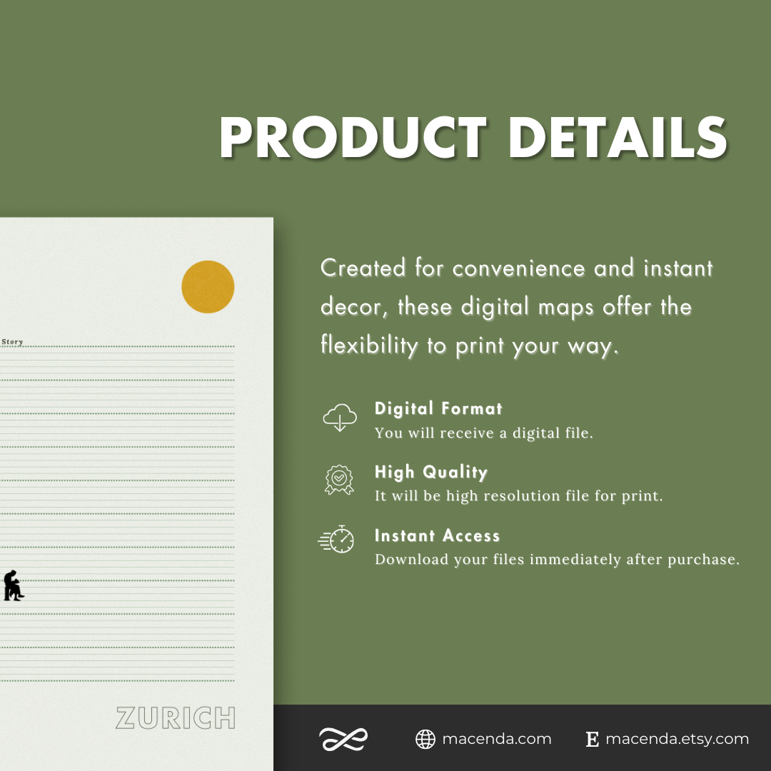 Discover tranquility with this Zurich digital download. A quiet, minimalist design that tells a story of peace. Print it at home today.